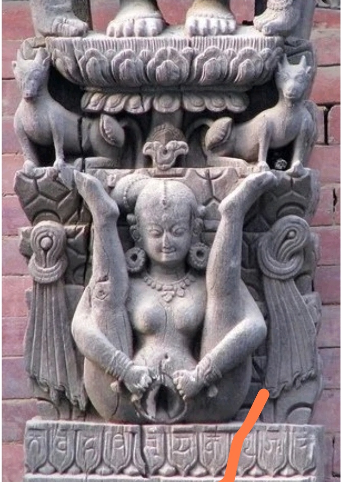 তার এই দেহভঙ্গিমাটি পরিপূর্ণরূপে পুরুষকে যৌনতায় আহ্বান করে আবার প্রসববেদনার মধ্যে নবজাতক ভূমিষ্ঠ হবার পূর্বমুহূর্তেরও প্রতীক এটি। পরবর্তীকালের ভিক্টোরিয়ান বা বলা ভালো পুরুষতান্ত্রিক মূল্যবোধ তার মাথাকে পদ্ম দিয়ে প্রতিস্থাপন করে যেন তাকে লজ্জিতা প্রতিপন্ন করে। কিন্তু প্রকৃতপক্ষে তাকে পুরুষের যৌনফ্যান্টাসির ডানা মেলে দেওয়া আকাঙ্ক্ষিত নারীদেহে রূপান্তরিত করার লক্ষ্যে তার মুণ্ডটি অ্যানোনিমাস রাখা হয়েছে। এছাড়া লজ্জার সঙ্গে তার কোনো সংযোগ নেই। (বস্তুত তিন চার হাজার খ্রিঃ পূঃ তে বিশ্বের বেশির ভাগ মূর্তিতেই মুখসংযুক্ত, কিন্তু ভারতে নয়। গ্রিক-রোমান-মিশরীয় দেবীরা প্রত্যেকে অত্যন্ত যৌনাকর্ষক মূর্তিতেই পূজিতা, ভারত কিন্তু তার দেবীদের মূর্তি এমনভাবে গড়েছে যাতে কোনোভাবেই তা দেখে যৌনতার উদ্রেক না হয়। চতুর্হস্তা, দশহস্তা, মুণ্ডমালিনী—ভারত বীরাচারী মতে দেবীকে স্ত্রী-প্রেমিকা দৃষ্টিতে দেখতে কম স্বচ্ছন্দ। তাই ভারতের দেবীমূর্তিরা মাতৃরূপা—স্নিগ্ধা, উগ্র যৌনাকর্ষক নন।)